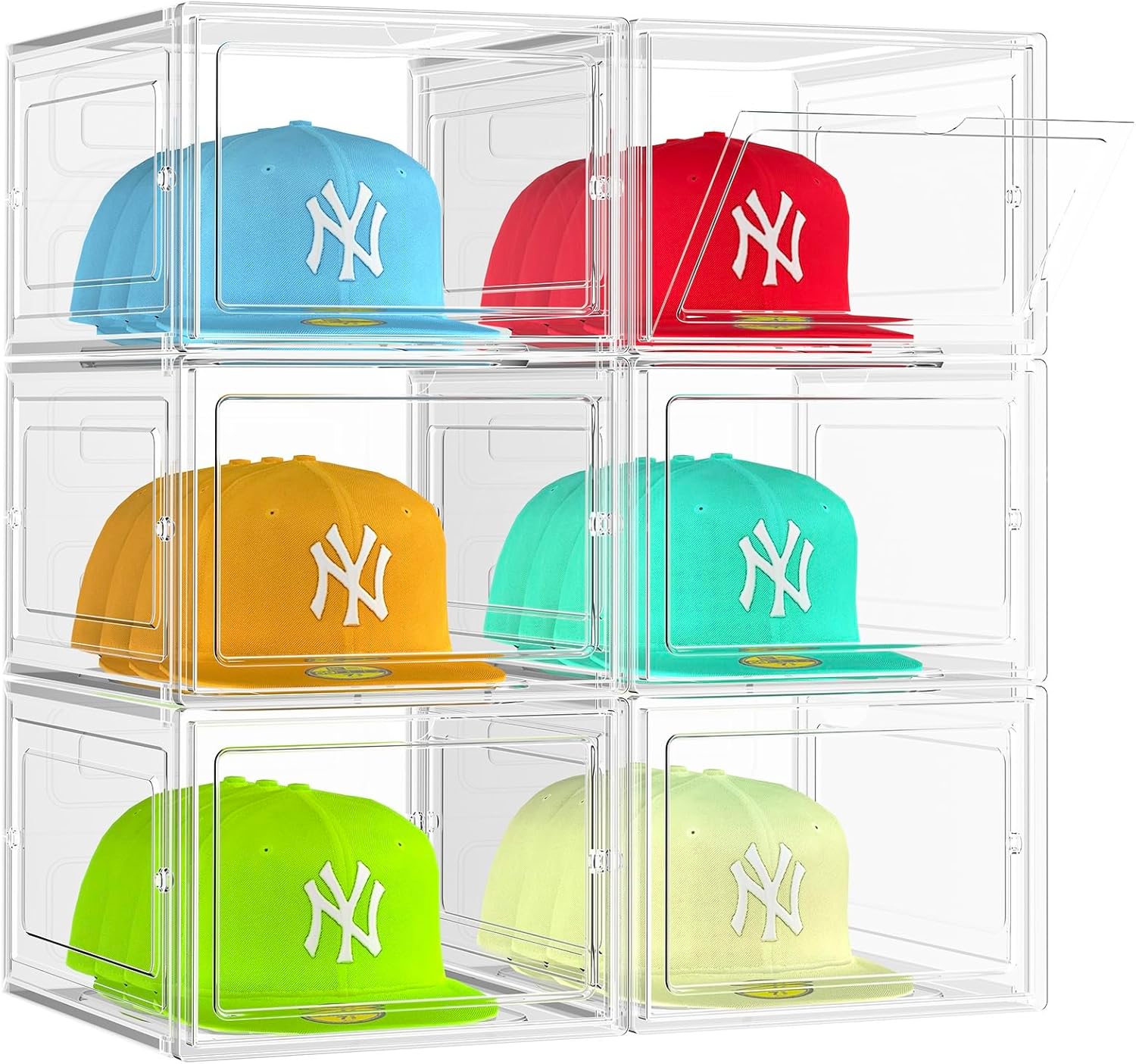 6 Pack Hat Organizer Box, Stackable Clear Baseball Caps Holder Box Containers with Magnetic Door for Hats Snapback Cap Storag, Hat Rack Display Case, Holds 8 Hats Each (Black)