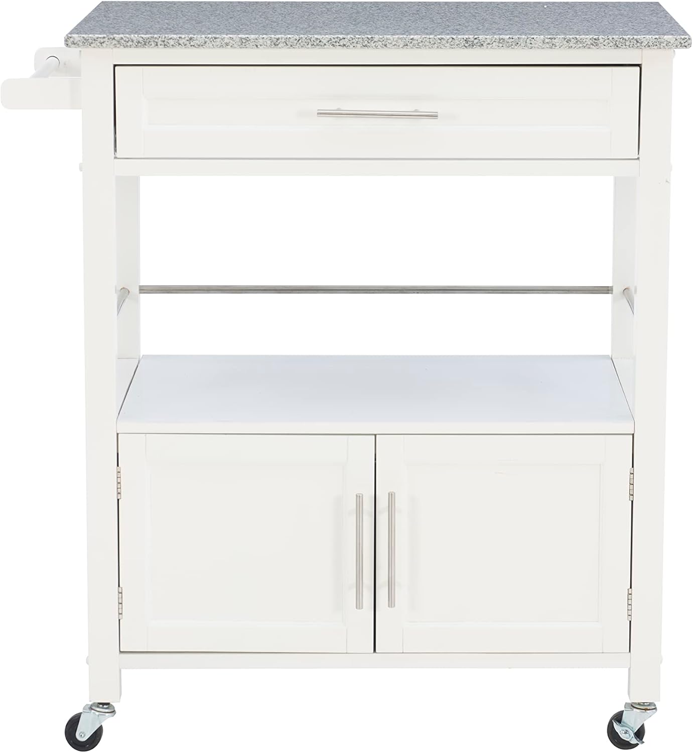 Balance style and function in your kitchen, dining, or living space with this classic cart. Infinitely adaptable, it’s ideal for food preparation, entertaining, coffee and bar service or storage. A clean white finish with silver hardware and a gray and white speckled granite top will complement your furnishings and house a coffee maker or compact microwave. The spacious drawer, shelf with metal railing, two-door cabinet and side towel bar provide generous storage. Easy rolling wheels move the cart effortlessly wherever needed for the finishing touch.
